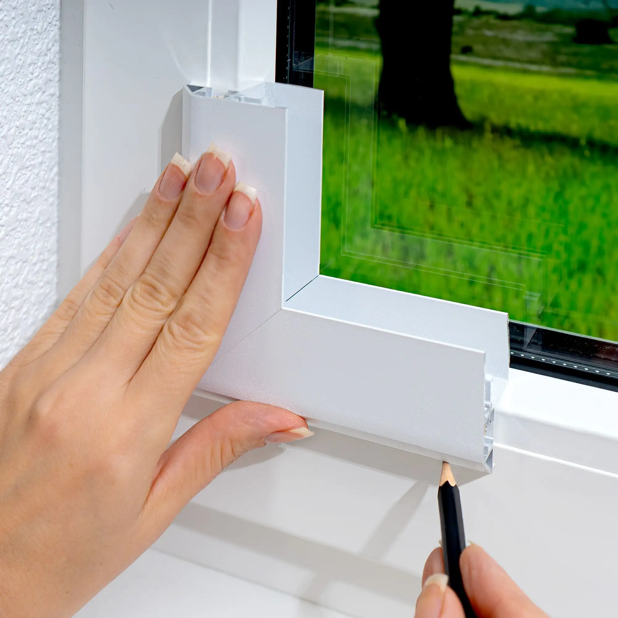Um das Fenster für den Smart Frame auszumessen, legen Sie die Messhilfe in der Glasleiste an und zeichnen Sie die Begrenzung außen am Rahmen vor. Genauso verfahren Sie auf der anderen Seite, messen anschließend den Abstand zwischen den Markierungen und nutzen diesen als Bestellmaß für Ihren Smart Frame. Ebenso wie der Smart Frame Plisseerahmen ist auch die Messhilfe in den Farben Schwarz, Anthrazit, Weiß und Off-White erhältlich. Somit können Sie direkt beim Messen veranschaulichen, wie der Smart Frame in Verbindung mit Ihrem Fensterrahmen wirkt.